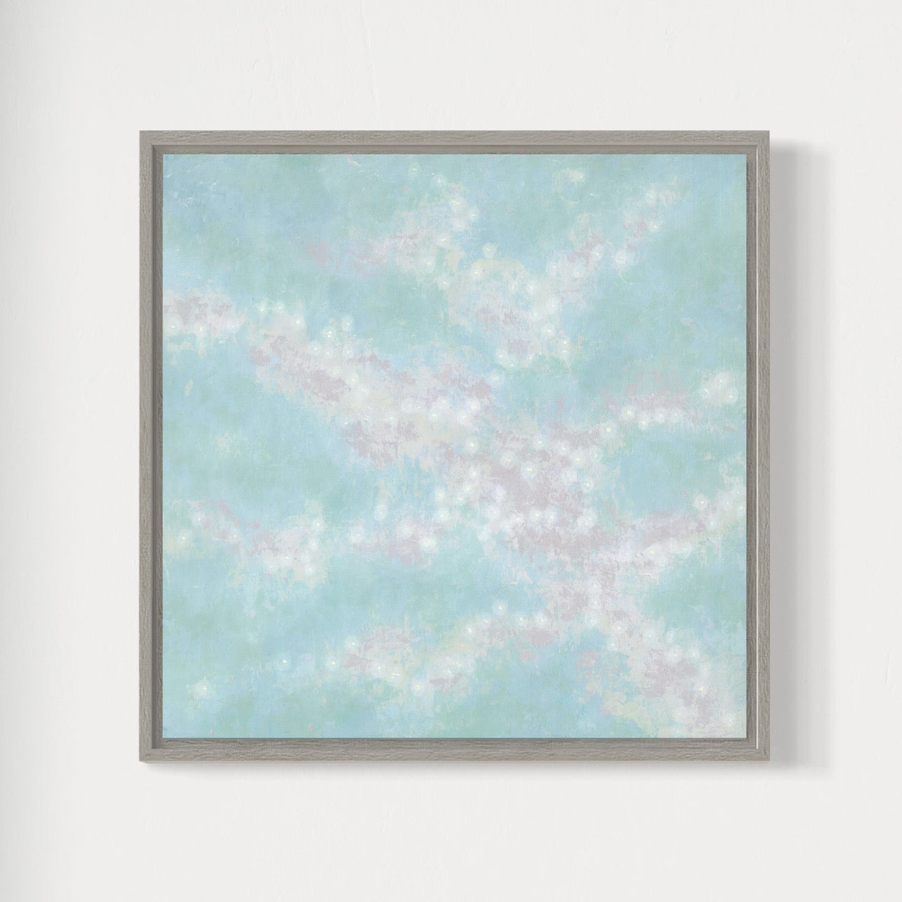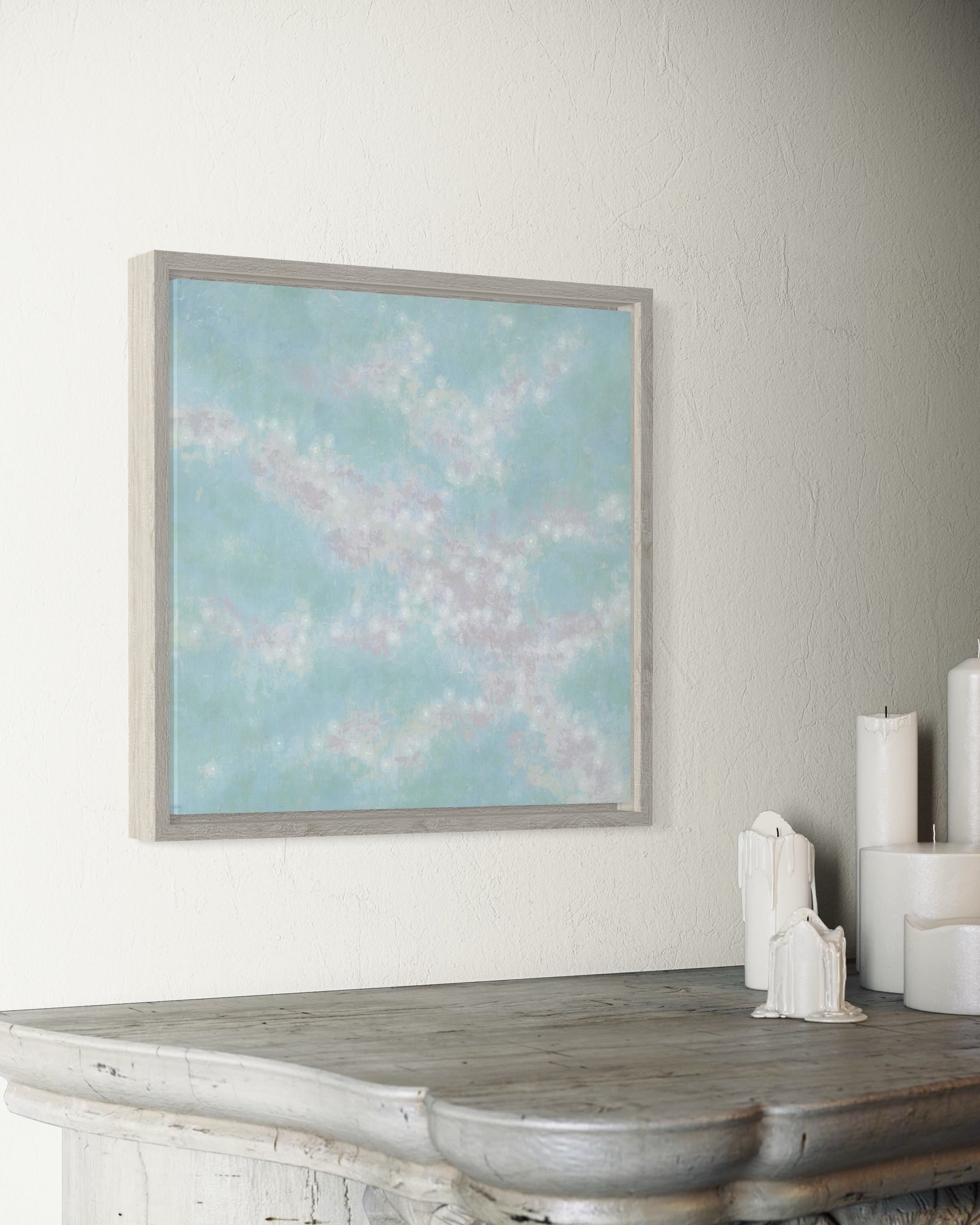 in custom whitewashed wood float frame, ready to hang.