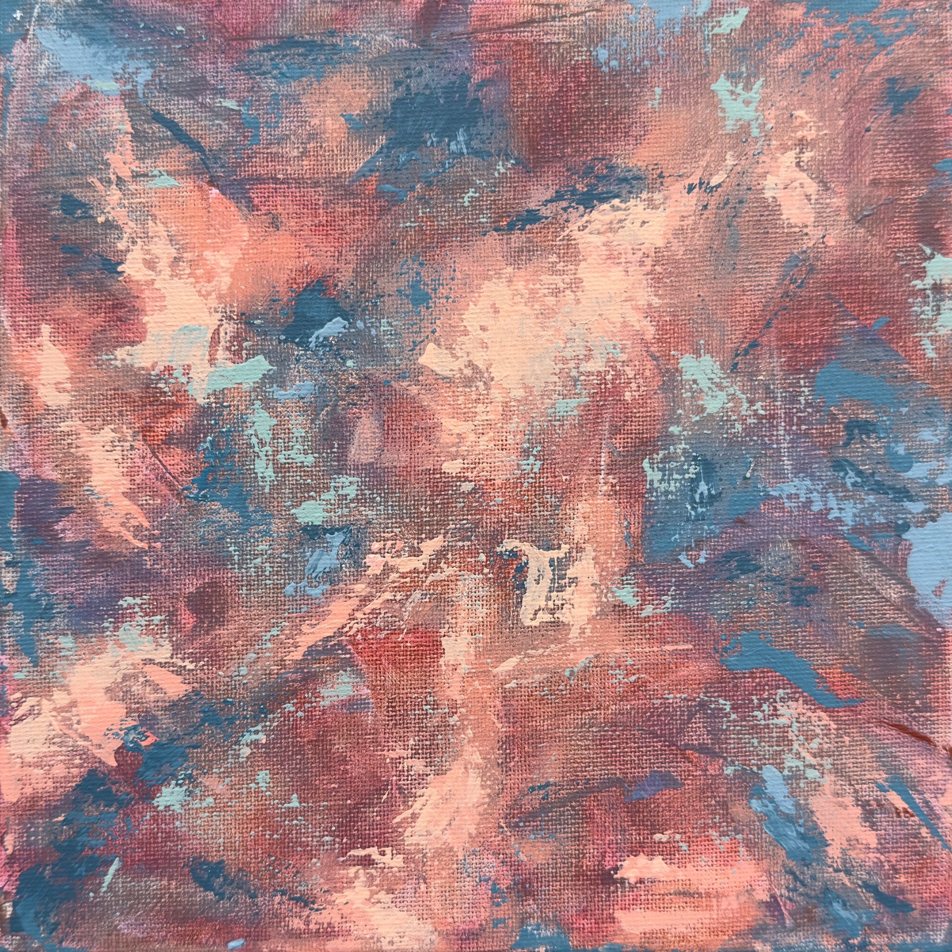 Blush pinks, rose tones, sky blues, and turquoise unfold across a textured, multidimensional surface,