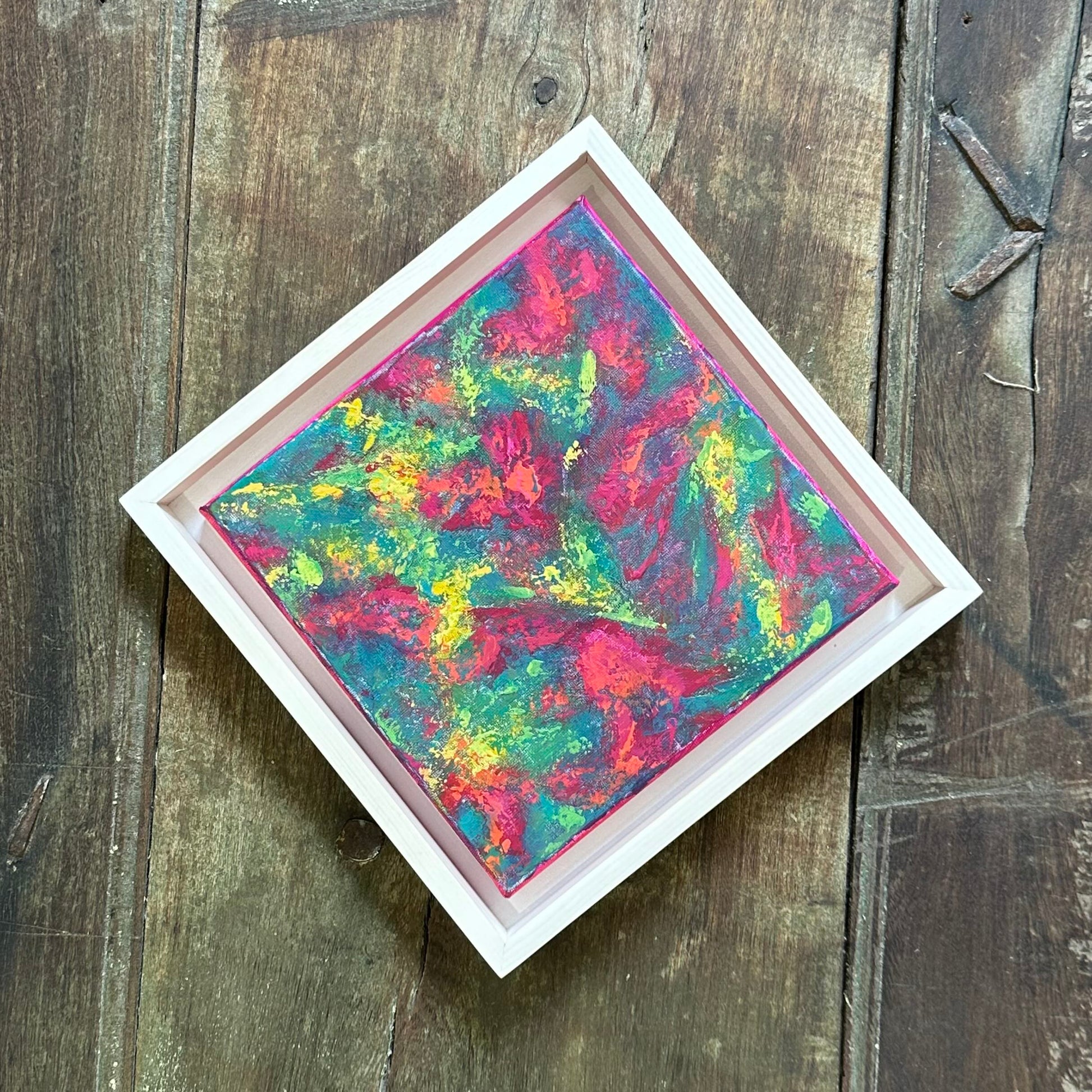 8x8 in | Acrylic on Canvas | 2025 | Framed in White-Washed Pine Wood Float Frame