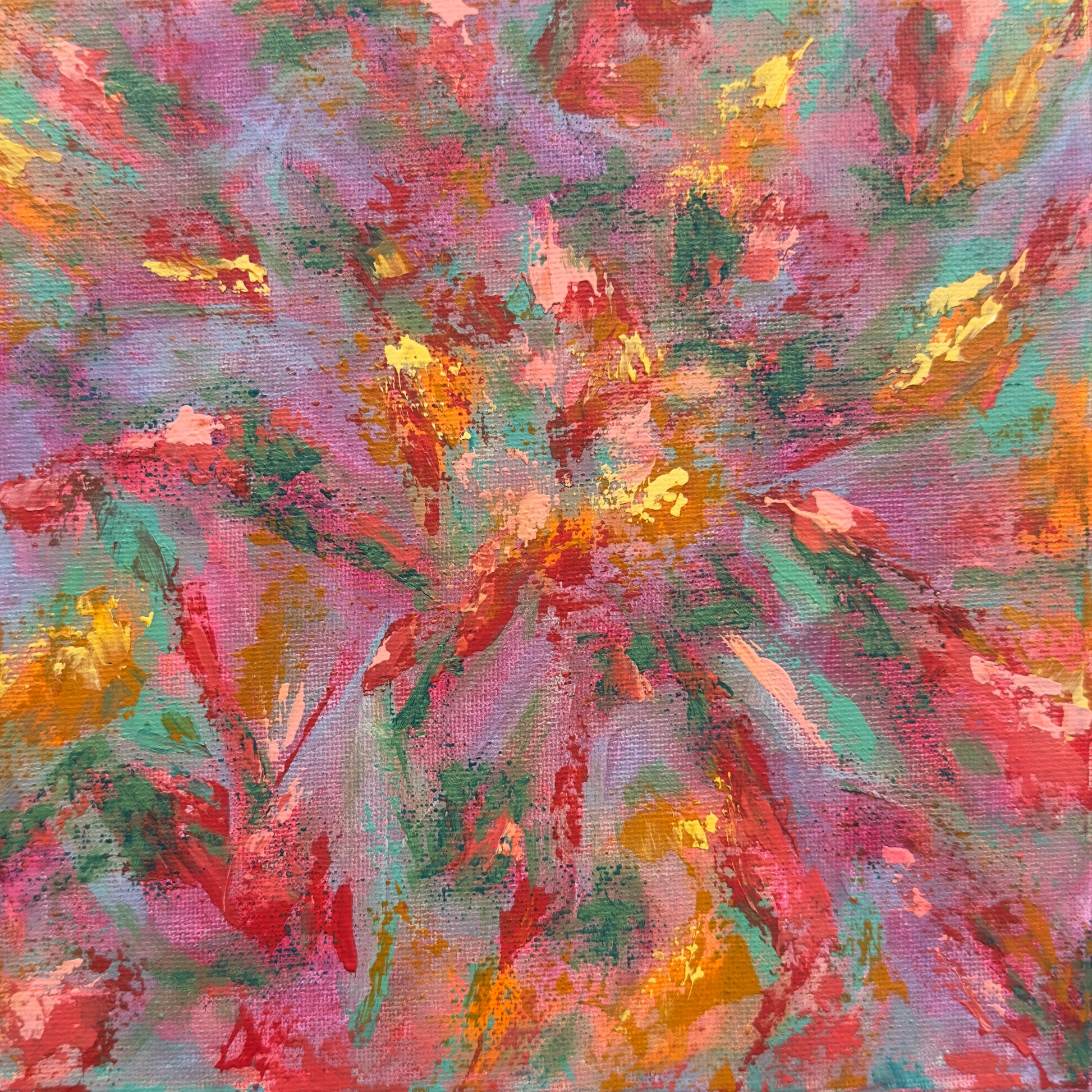 Soft lavender and fuchsia tones form the foundation of this piece, while vibrant streaks of red, orange, yellow, and mint green burst outward from the center